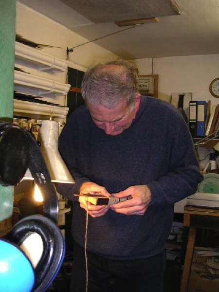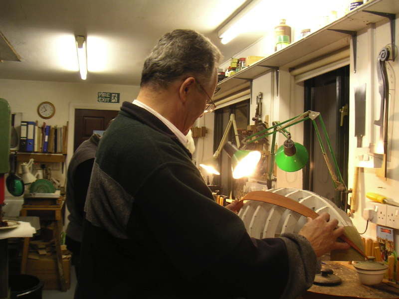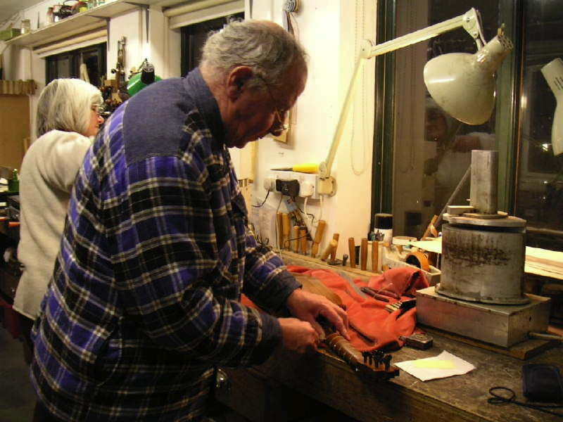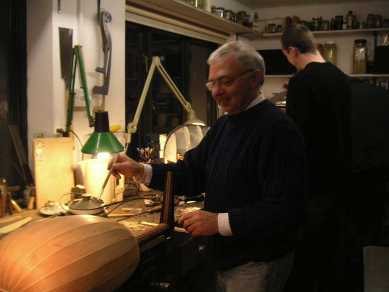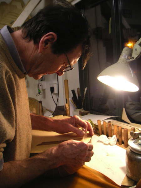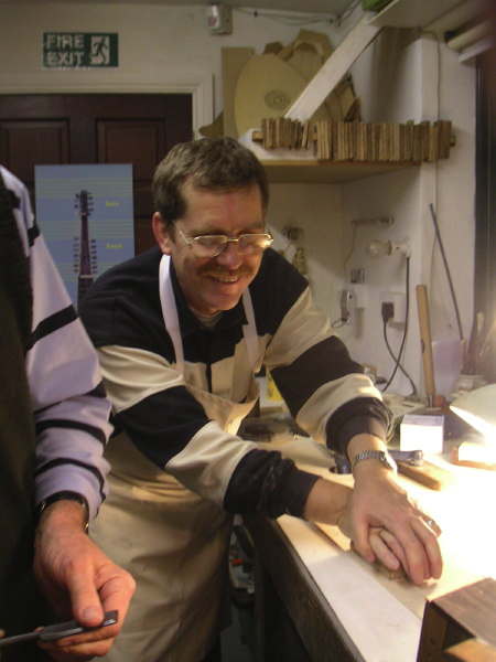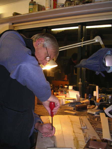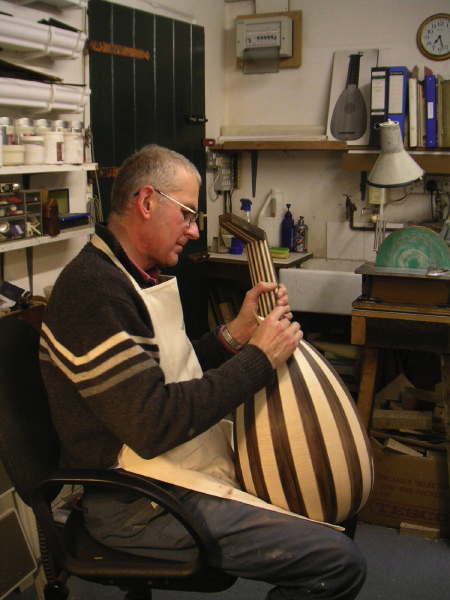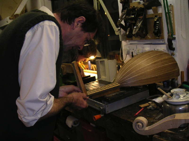 Derek fitting the decorative inlay panel on the pegbox back of his twelve course lute