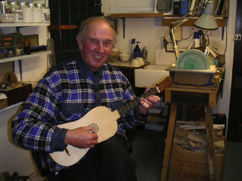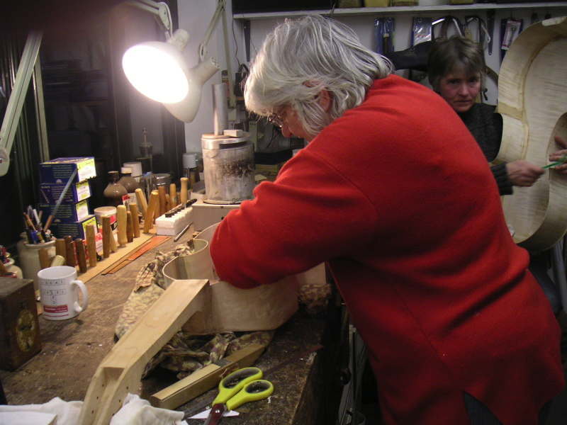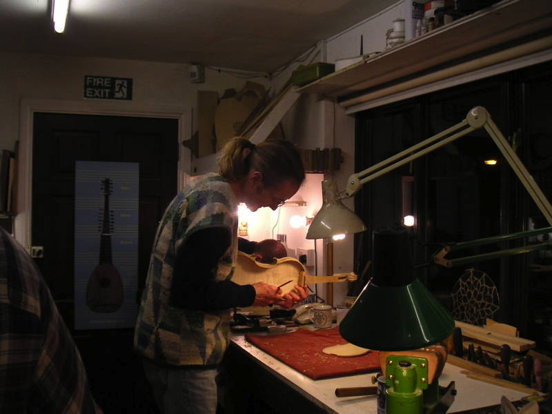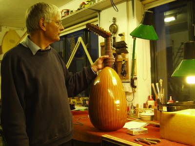 Carl playing his newly finished tenor lute based on VVendelio Venere (Vienna C36). In the background, Anna working on the back of her second cello and Tim working on a rebec.