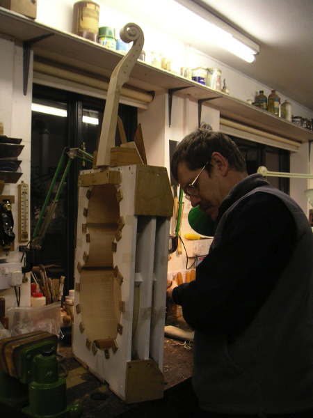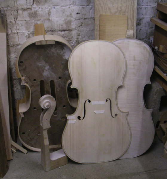 Here is a group of instruments which was under way in January 2006 showing the almost finished bass viol, the cello , another 'Ud, a violin, a tenor viol and five different lutes.
