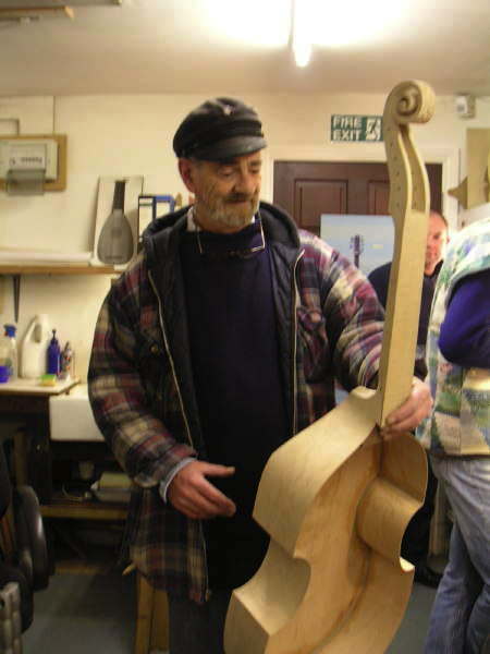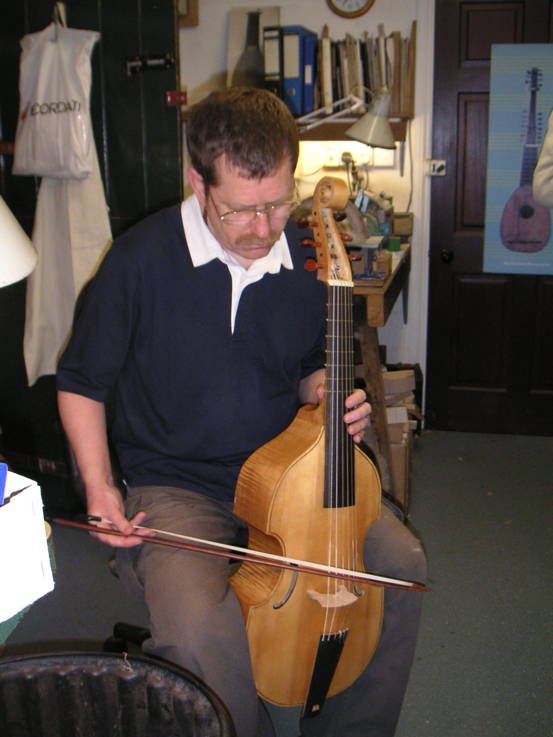 Tim drawing the first bow stroke across his newly finished tenor viol.
