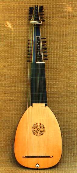 64cm & 93cm, 14 courses (7 x 2 + 7 x 2) after Matteo Sellas 1637 (Gemeentemuseum) 17 ribs, the original is similar in decorative detail to the Paris instrument but without the engraved fingerboard panels. The larger size gives a more satisfactory sound, although both sizes appear to have been common. For tuning in G.