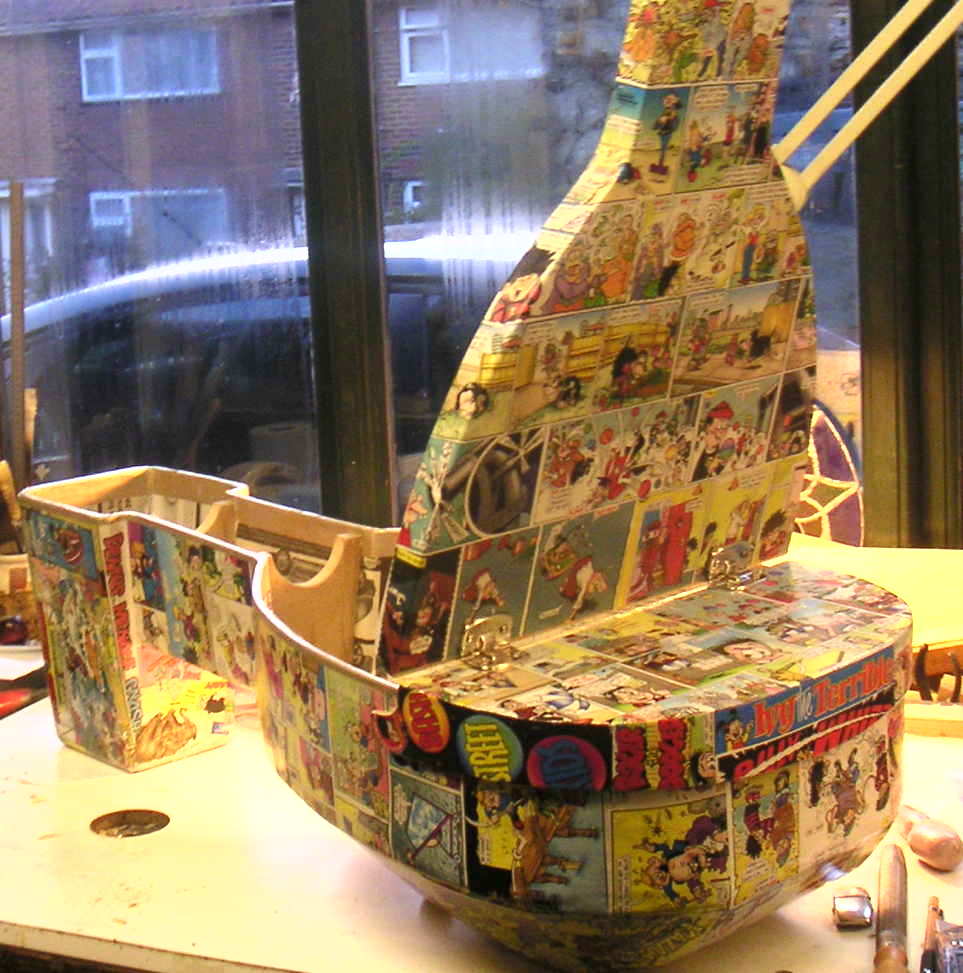 Dannys wonderful papiermaché lutecase covered with prints from Dennis the Menace comic strips in the Beano. Technically the case was light and strong and constructed in the same form as renaissance lute cases with a vertically opening lid, but given a contemporary twist! Eventually it was lined with a lascivious red velvet but alas I dont have pictures of that. For comparison below is an engraving showing a typical contemporary lute case.