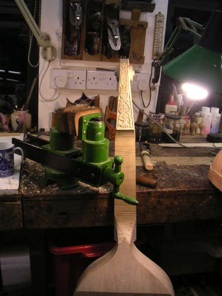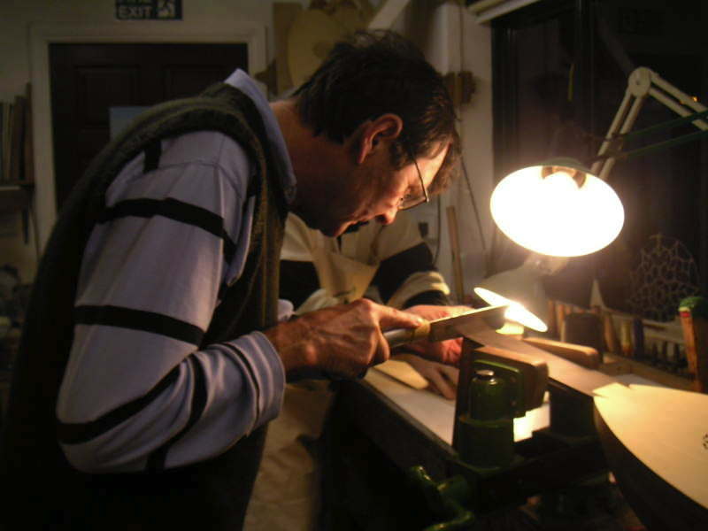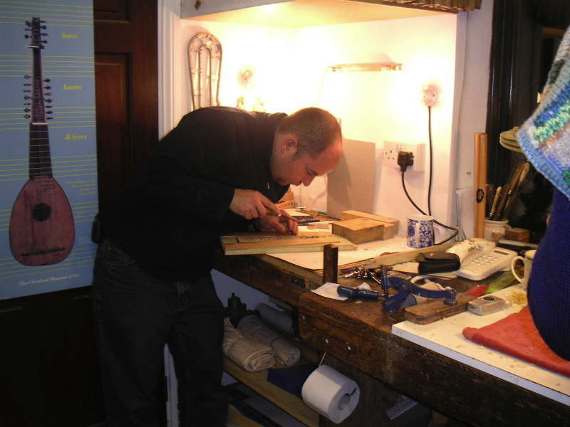 Derek fitting the decorative inlay panel on the pegbox back of his twelve course lute