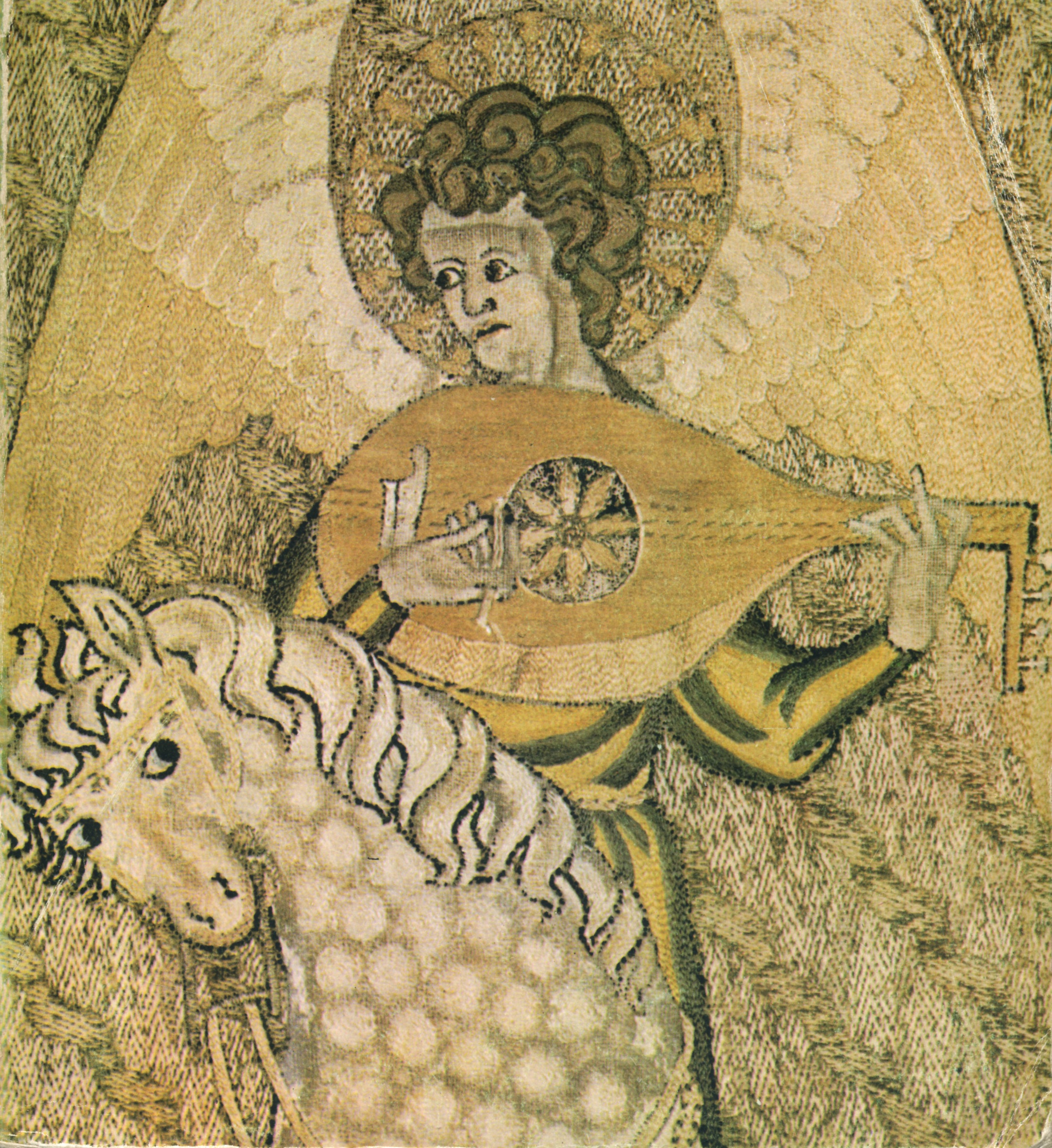 Steeple Aston Cope c.1310-1340 (Opus Anglicanum) earliest known English representation of a lute. V&A London