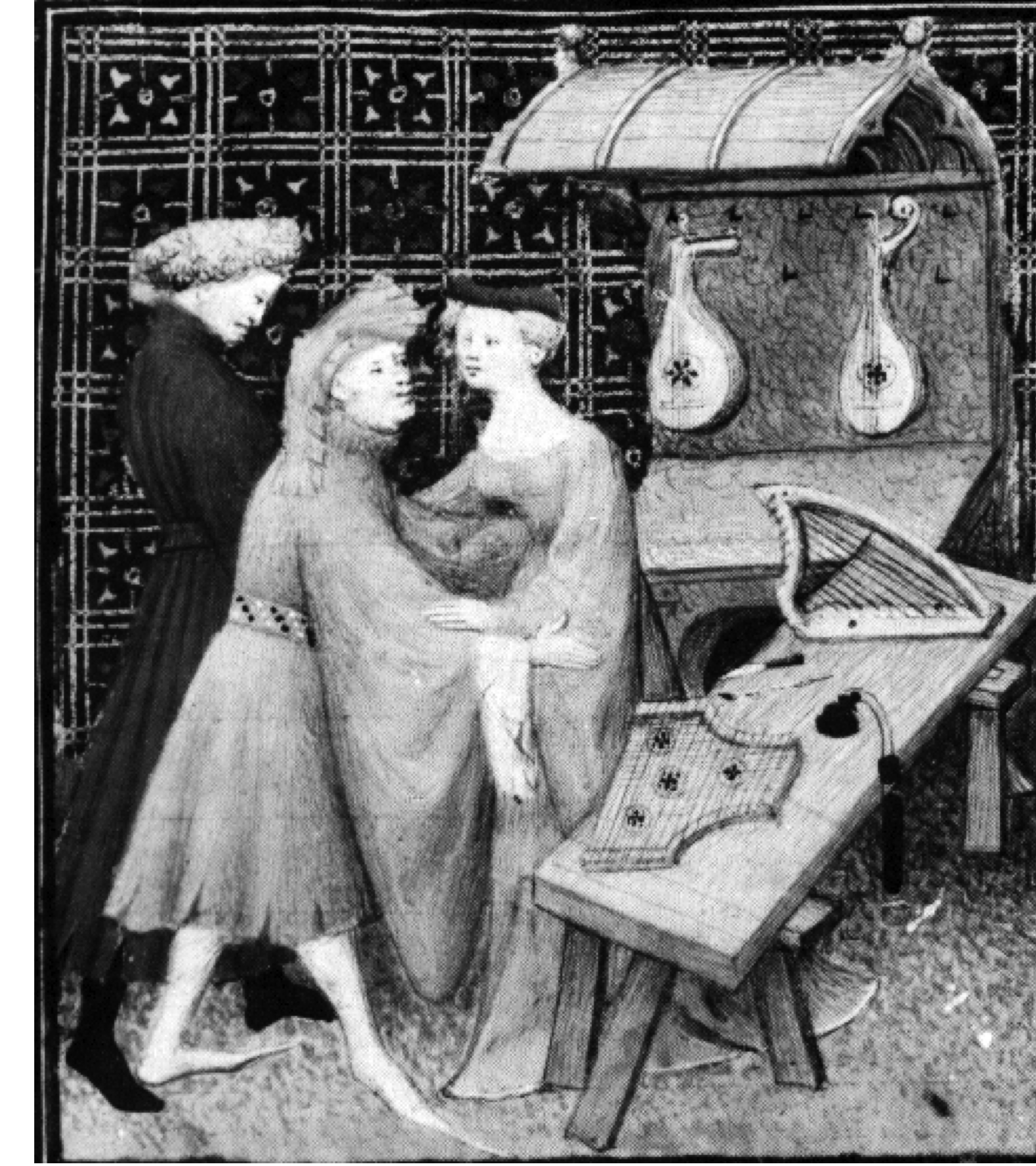 Circa 1400 we even have an idealised picture of a lutemaker’s workshop and sales showroom in France!