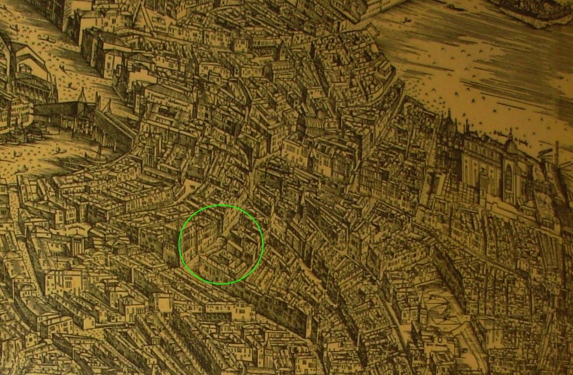 He lived here in Calle dei Stagneri [alley of the tinsmiths] shown in the Jacopo de Barbari map of 1500