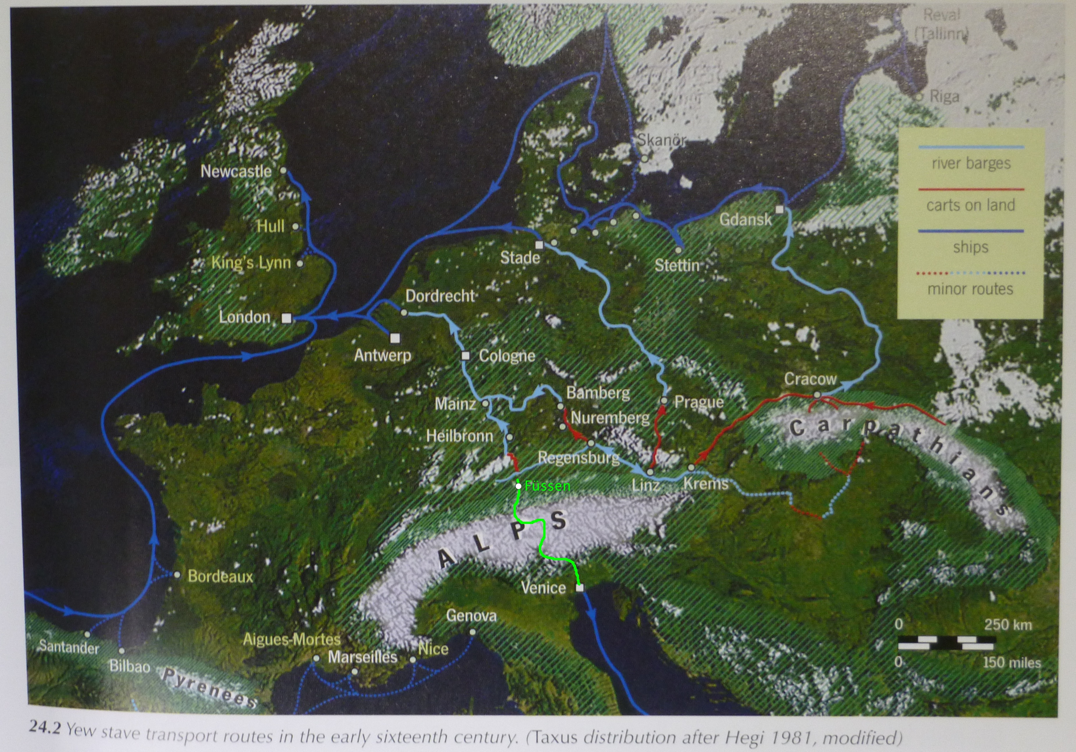 It was a huge and lucrative trade, in 1510 Henry VIII, again, agreed to buy 40,000 bow staves from the Doge of Venice at £16 per hundred, and in 1521 the Austrian monarchy demanded 5 Rhineland guilders per 1000 staves and Balthasar Lurtsch bought 20,000 staves. The Nürnberg Fürer company, who held yew privileges in South Germany and Austria, are calculated to have exported 1,600,000 staves in the period 1512-1592. This map of the export transport routes for yew bowstaves reminds us of the infrastructure needed, and of course that it would be almost identical to the routes used for finished lutes.